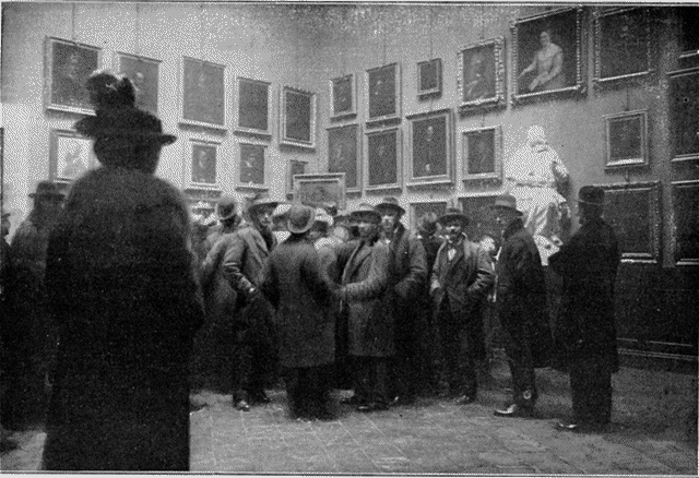 La Joconde, parée d'un cadre ancien, fut disposée sur un chevalet drapé de velours grenat. Une barrière improvisée, formée de lourdes banquettes sculptées, fut disposée en avant, pour la défendre contre d'irrespectueux contacts. Des policiers veillèrent alentour, mêlés aux gardiens. Le public impatient fut enfin introduit, et, dans la seule journée de dimanche, plus de 30.000 personnes purent contempler l'énigmatique regard des yeux bruns, le divin sourire des lèvres décolorées de Monna Lisa.