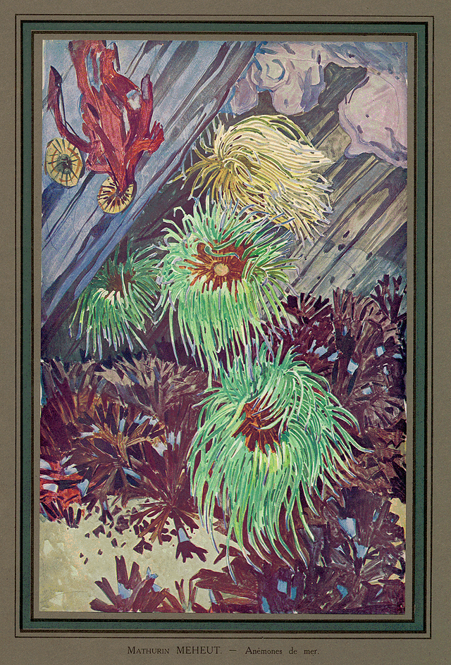 J'incline à penser que ceux qui ont travaillé à résoudre le problème de la navigation sous-marine ont fait davantage pour la satisfaction des vieux rêves humains que les Icares qui conquirent le ciel. Là-haut, quel mystère depuis qu'on nous a dépeuplé l'empyrée? Sur ce pauvre monde et d'autres qui, sans doute, ne valent pas beaucoup mieux, une vue un peu différente, un peu plus élevée, voilà tout... Qu'est-ce que cela doit être, alors, de Sirius? pour reprendre une parole fameuse. Quoi encore? la joie d'une victoire sur les forces, la réalisation, certes, d'un très ardent désir qui hanta de tous temps les cervelles, une griserie de vitesse et d'espace... Dans les profondeurs abyssales, au contraire, que de secrets joyaux, de merveilles insoupçonnées à découvrir! quelles apparitions vierges! quelles féeries! On nous parlait ici, naguère, de je ne sais quel projet d'observatoire sous-marin, installé pour le plaisir de quelques oisifs. Il faut s'étonner qu'en ces temps entreprenants personne n'ait songé à créer un sous-marin, non plus engin de mort et de dévastation, mais navire de plaisance, où des privilégiés avides de beauté rare exploreraient le fond des océans, non pour en ramener des organismes bientôt morts et méconnaissables, mais pour aller les surprendre dans leurs abîmes familiers, en pleine vie, en plein rayonnement;--que personne, enfin, n'ait tenté de réaliser le Nautilus de Jules Verne, où notre enfance promenait de si beaux songes. Dans la mesure où il était possible de satisfaire nos curiosités touchant ce domaine inviolé, M. Mathurin Méheut l'a fait.