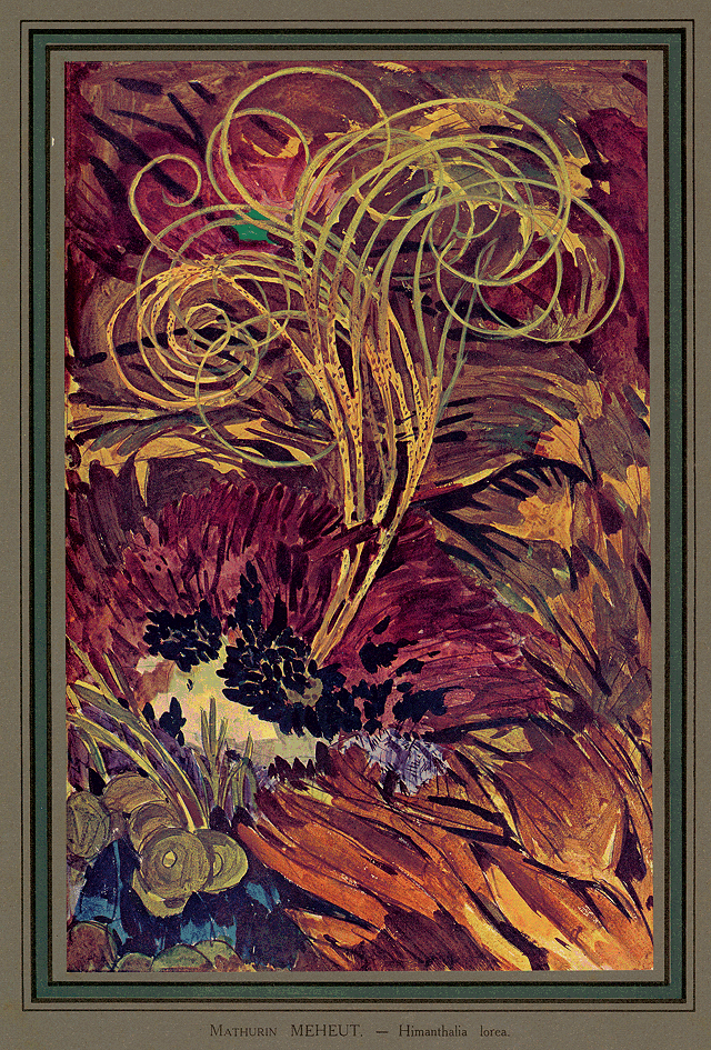 Mais, surtout, ce qui domine cette exposition, la note nouvelle, imprévue et singulièrement attrayante qu'elle nous apporte, et par où s'affirme une personnalité profondément sympathique, c'est cette suite d'études, aquarelles, gouaches, cursives esquisses au pinceau, alertes ébauches ayant le mouvement, l'inattendu, la vérité même du cliché photographique--ou mieux, de ces prestigieux croquis japonais où l'exactitude de la ligne se rehausse de ce quelque chose d'indéfinissable et d'irrésistible qu'est le style--dans lesquelles M. Mathurin Méheut a évoqué la faune et la flore des eaux glauques, toute la mystérieuse vie sous-marine.