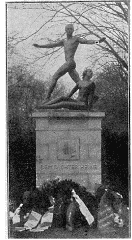 C'est, aujourd'hui, l'ancienne ville indépendante de Francfort-sur-le-Mein qui a pris l'initiative de rendre publiquement hommage à l'auteur des Reisebilder. Le monument qui lui est consacré est l'oeuvre du sculpteur Georges Kolbe: il symbolise, d'une manière assez originale, par deux figures, l'une légère, dressée, semble-t-il, en équilibre, l'autre douloureuse, meurtrie, la fantaisie et l'amertume de l'écrivain; un médaillon, où revivent ses traits, est placé sur le piédestal, au-dessus d'une simple inscription: «Au poète Heine».