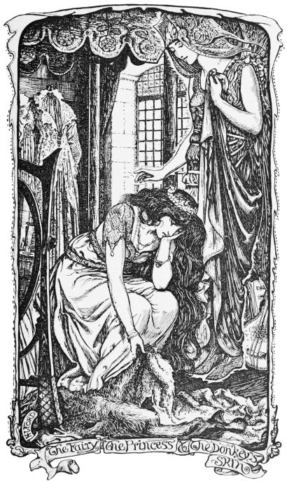 The dark gallery seemed darker than ever as he turned away, but he went back to the kitchen and inquired who slept in the room at the end of the passage. The scullery maid, they told him, whom everybody laughed at, and called 'Donkey Skin;' and though he perceived there was some strange mystery about this, he saw quite clearly there was nothing to be gained by asking any more questions. So he rode back to the palace, his head filled with the vision he had seen through the keyhole.