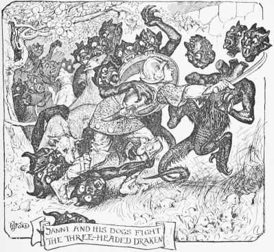 The king and his equerry stood still to watch this strange hunt, which was followed by twenty or more little dwarfs, some mounted on wolves, and leading relays, and others with cats in leash. The dwarfs were all dressed in purple silk liveries like the apes.