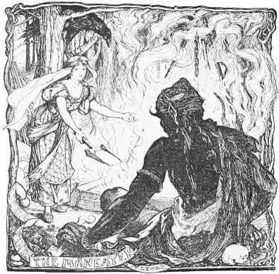When they had done their supper they looked about for some place to sleep. But suddenly the door burst open, and the wizard entered the hall. He was old and hump-backed, with a bald head and a grey beard that fell to his knees. He wore a black robe, and instead of a belt three iron circlets clasped his waist. He led by the hand a lady of wonderful beauty, dressed in white, with a girdle of silver and a crown of pearls, but her face was pale and sad as death itself.
