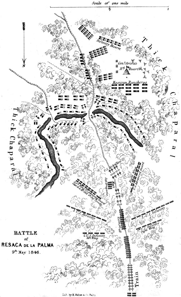 When the sun rose on the morning of the 9th a mist of mingled smoke and vapor hung over the battle field of Palo Alto, but, as the haze lifted from the levels, the Mexicans were perceived retreating by their left flank, in order, perhaps, to gain a more advantageous position on the road in which they might resist our progress towards Matamoros. This movement inspirited our troops, who, craving the interest of a new position, were loath to repeat the battle of yesterday on the same field. Accordingly General Taylor ordered the supply train to be parked at its position and left under the guard of two twelve-pounders and the fatal eighteens which had done such signal service on the 8th. The wounded men and officers were next despatched to Point Isabel, and we then moved across the Llano Burro towards the edge of the dense chapparal which extends for a distance of seven miles to the Rio Grande. The light companies of the first brigade under Captain Smith, of the second artillery; and a select detachment of light troops, all commanded by Captain McCall, were thrown forward into the thickets to feel the enemy and ascertain the position he finally took.