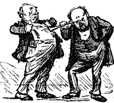 And so the war was carried on, Tim's heart being at last softened by King-Harman declaring that he had saved him from ill-treatment at Dungannon at the hands of some gentlemen who wanted to show him "how to cheer for the Queen" with a stick. "I got hold of the men by the neck and hurled them back," cried King-Harman, unsuccessfully controlling his emotion, "and now he—he—he says I got into a ro—ow—ow at Cremorne."