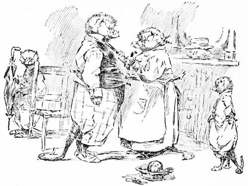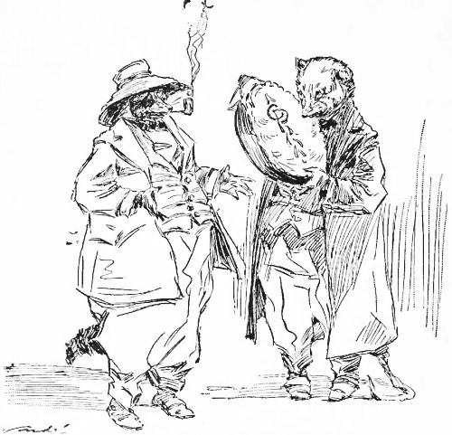 Well, he had to work pretty hard, I tell you, to get things ready. It wasn't so hard to get the presents as it was to rig[Pg 264] up his Santa Claus dress. He found some long wool out in Mr. Man's barn for his white whiskers, and he put some that wasn't so long on the edges of his overcoat and boot tops and around an old hat he had. Then he borrowed a big sack he found out there, too, and fixed it up to swing over his back, just as he had seen Santa Claus do in the pictures. He had a lot of nice things to take along. Three tender young chickens he'd borrowed from Mr. Man, for one thing, and then he bought some new neckties for the Hollow Tree folks all around, and a big, striped candy cane for each one, because candy canes always looked well sticking out of a stocking. Besides all that, he had a new pipe for each, and a package of tobacco. You see, Mr. Dog lived with Mr. Man, and didn't ever have to buy much for himself, so he had always saved his money. He had even more things than that, but I can't remember just now what they were; and when he started out, all dressed up like Santa Claus, I tell you his bag was[Pg 265] pretty heavy, and he almost wished before he got there that he hadn't started with quite so much.