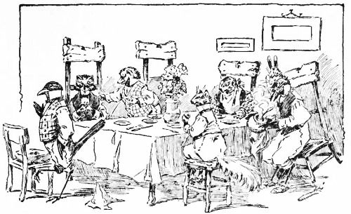 And the bluebird up in the branches whistled and danced and shouted, too; and Jack Rabbit and Mr. Dog came over pretty soon to see if they'd got home yet. And of course Mr. Rabbit was proud about the way his poem had turned out; and Mr. Dog he was proud, too, on Mr. Man's account. Then they all had a big supper, to celebrate, and by-and-by Mr. Rabbit and Mr. Dog went away arm in arm, singing Mr. Rabbit's poem to the moon; while the 'Coon and 'Possum and the old black Crow went to bed happy because they had followed Spring clear around the world, and hadn't got lost or tumbled off into the sky, but were home again safe and sound in the Hollow Tree.[Pg 259]