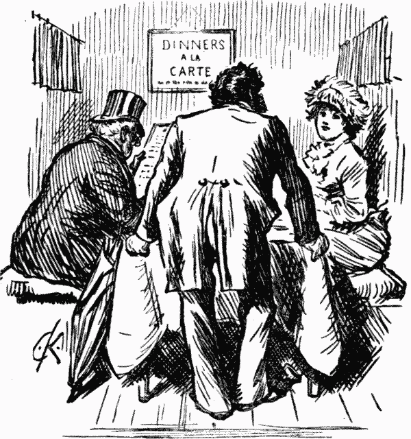 Tommy (who is standing a feed to Harry). "Oh, hang it, you know, fourteen bob for a bottle of champagne! That's coming it rather strong, ain't it?"