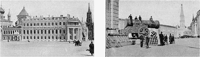 | Le Petit Palais qu'habitait, au Kremlin, le grand-duc Serge, depuis qu'il avait abandonné le gouvernement général de Moscou. | La place du Sénat, où a eu lieu le meurtre. Au fond, la porte Nikolsky: au premier plan, le «tsar des canons».--Phot. Eastman Kodak. |