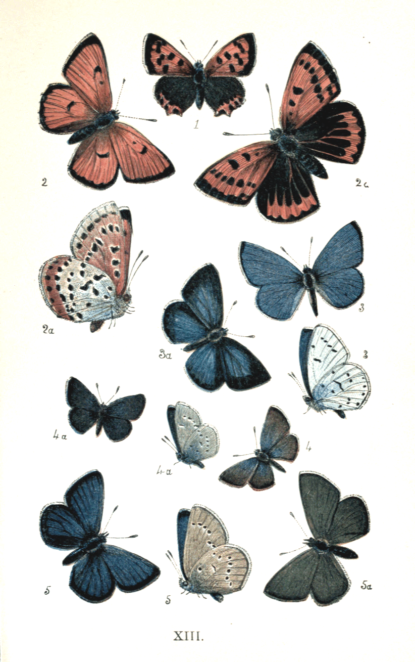 The greater number of the caterpillars and chrysalides, however, being rarely met with, the figures on the first plate are nearly all borrowed from the splendid and accurate works of Continental authors—chiefly from Hübner and Duponchel.
