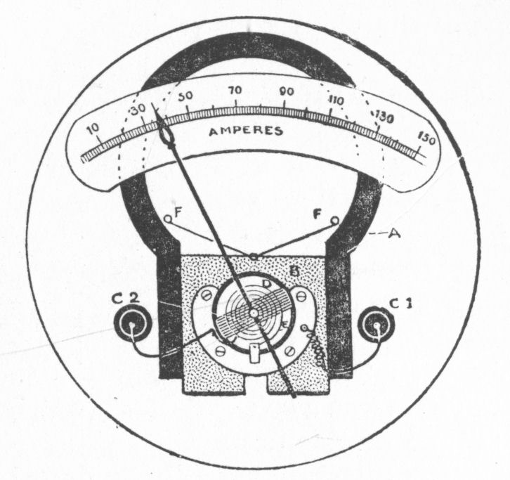 Almost invariably an ammeter gives its full-scale reading when a small current, say of the order of one-tenth of an ampere, is passing through the instrument itself. In order to read larger currents a device is employed whereby a definite fraction of the current to be measured [144]passes through the instrument.—Bibliography: J. A. Fleming, A Handbook for the Electrical Laboratory and Testing Room (2 vols.); G. D. Aspinall Parr, Electrical Measuring Instruments.