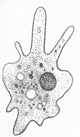 Amœ´ba, a microscopic genus of rhizopodous Protozoa, of which A. difflŭens, common in freshwater ponds and ditches, is the type. It exists as a mass of protoplasm, and pushes its body out into finger-like processes or pseudopodia, and by means of these moves about or grasps particles of food. There is no distinct mouth, and food is engulfed within any portion of the soft sarcode body. Reproduction takes place by fission, or by a single pseudopodium detaching itself from the parent body and developing into a separate amœba.