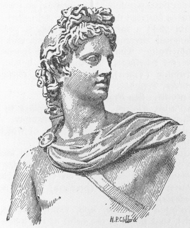 Athē´na, or Athēnē, a Greek goddess, identified by the Romans with Minerva, the representative of the intellectual powers; the daughter of Zeus (Jupiter) and Mētis (that is, wisdom or cleverness). According to the legend, before her birth Zeus swallowed her mother, and Athena afterwards sprang from the head of Zeus with a mighty war shout and in complete armour. In her character of a wise and prudent warrior she was contrasted with the fierce Ares (Mars). In the wars of the giants she slew Pallas and Enceladus. In the wars of the mortals she aided and protected heroes. She is also represented as the patroness of the arts of peace. The sculptor, the architect, and the painter, as well as the philosopher, the orator, and the poet, considered her their tutelar deity. She is also represented among the healing gods. In all these representations she is the symbol of the thinking faculty, the goddess of wisdom, science, and art; the latter, however, only in so far as invention and thought are comprehended. In the images of the goddess a manly gravity and an air of reflection are united with female beauty in her features. As a warrior she is represented completely armed, her head covered with a gold helmet. As the goddess of peaceful art she appears in the dress of a Grecian matron. To her insignia belong the Ægis, the Gorgon's head, the round Argive buckler; and the owl, the cock, the serpent, an olive branch, and a lance were sacred to her. All Attica, but particularly Athens, was sacred to her, and she had numerous temples there. Her most brilliant festival at Athens was the Panathenæa.