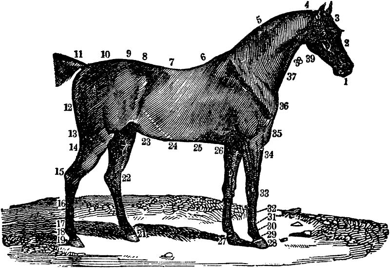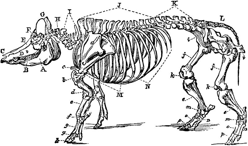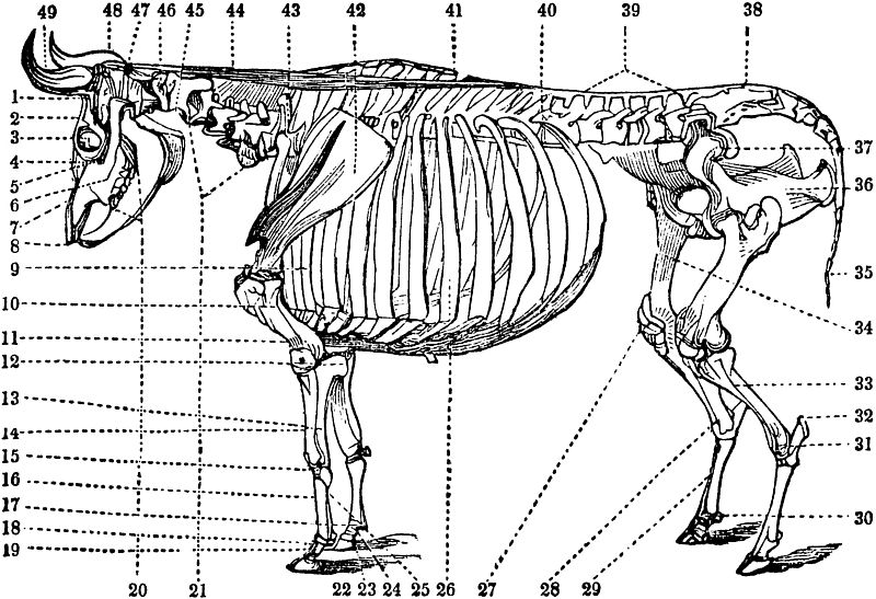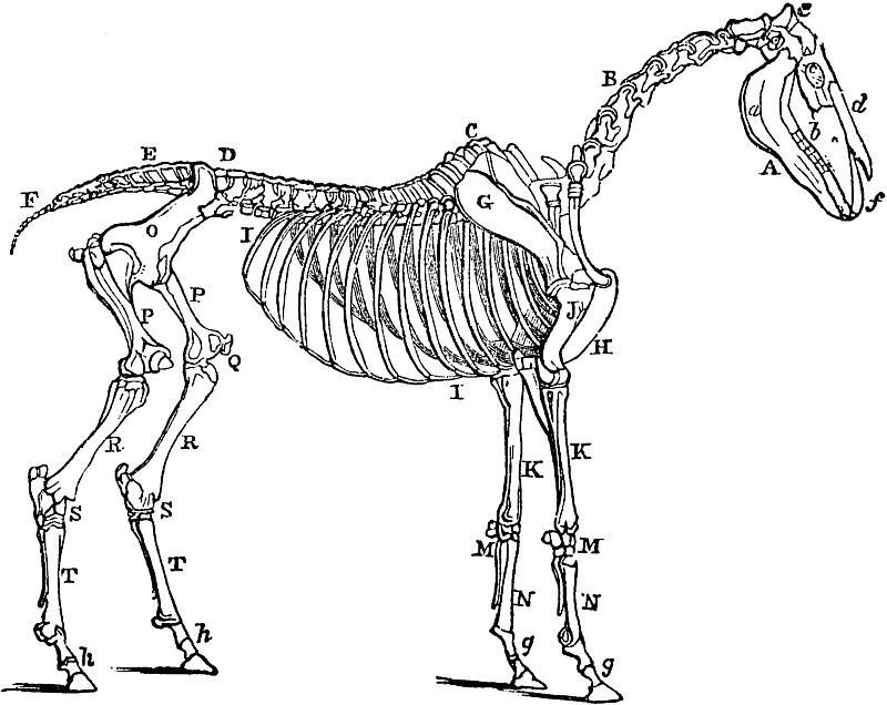 A Maxilla inferior, vel posterior; lower jaw.—B Dentes; the teeth.—C Ossa nasi; the nasal bones.—D Maxilla superior, vel anterior; upper jaw.—E Os frontis; the frontal bone.—F Orbiculus; the orbit or socket of the eye.—G Os occipitis; the occipital bone.—H Atlas; the first vertebra of the neck.—I Vertebræ colli, vel cervicales; the vertebræ of the neck.—J Vertebræ dorsi, vel dorsales; the vertebræ of the back.—K Vertebræ lumborum, vel lumbales; the vertebræ of the loins.—L Ossa coccygis; the bones of the tail.—a Scapula; the shoulder-blade.—b Humerus; the round shoulder-bone.—c Sternum; the breastbone.—d Ulna; the elbow.—e Radius; the bone of the fore-arm.—f Os naviculare: the navicular bone.—g Phalanges vel ossa pedis; the first and second bones of the foot.—h Phalanges, vel ossa pedis; the bones of the hoof.—i Pelvis, (ossa innorninata;) the haunch bones.—j Os femoris; the thigh-bone.—k Patella; the stifle-bone.—l Tibia; the upper bone of the leg—m Tarsus, (one of which is the (N) os calcis;) the hock-bones.—n Os naviculare; the navicular bone.—o Digiti, vel phalanges, (ossa pedis;) the first digits of the foot.—p Digiti, vel phalanges, (ossa pedis;) the second digits of the foot.