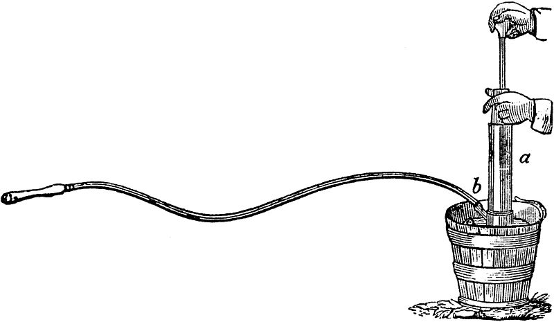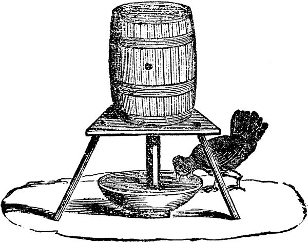 Water is placed in the cask as represented in the Fig., and it is then closely stopped, except an opening through a tube leading into a vessel below. As the water is exhausted from this, it descends from the cask above, and a supply is thus at all times within reach of the poultry.