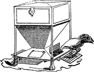 Their food is better when given to them warm, not hot, and there should always be a supply before them to prevent gorging. It is better to be placed on shelves or suspended boxes or hoppers, which are variously and cheaply constructed, to keep it clean and out of the reach of rats. Besides their food, hens ought to be at all times abundantly supplied with clean water, egg or pounded oyster shells, old mortar or slacked lime. If not allowed to run at large, where they can[Pg 218] help themselves, they must also be furnished with gravel to assist their digestion; and a box or bed of ashes, sand, and dust, is equally essential to roll in for the purpose of ridding themselves of vermin.