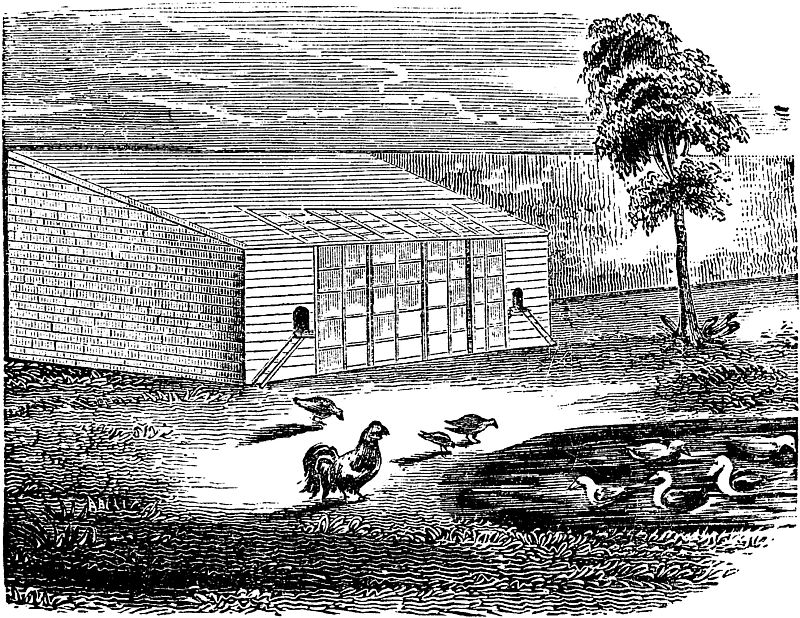May be constructed in various ways to suit the wishes of the owner, and when tastefully built it is an ornament to the premises, It should be perfectly dry throughout, properly lighted, and capable of being made tight and warm in winter, yet afford all the ventilation desirable at any season. In this, arrange the nests in boxes on the sides, in such a manner as to humor the instinct of the hen for concealment when she resorts to them. When desirable to set the hen, these nests may be so placed as to shut out the others, yet open into another yard or beyond the enclosure, so that they can take an occasional stroll and help themselves to food, &c. This prevents other hens laying in their nests, while setting; and it may be easily managed, by having their boxes placed on the wall of[Pg 219] the building, with a moveable door made to open on either side at pleasure. Hens will lay equally well without a nest-egg, but when broken up, they ramble off and form new nests, if they are not confined. They will lay if kept from the cock, but it is doubtful if they will thus yield as many eggs. Hens disposed to set at improper times, should be dismissed from the common yard, so as to be out of reach of the nests, and plentifully fed till weaned from this inclination.