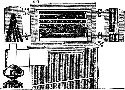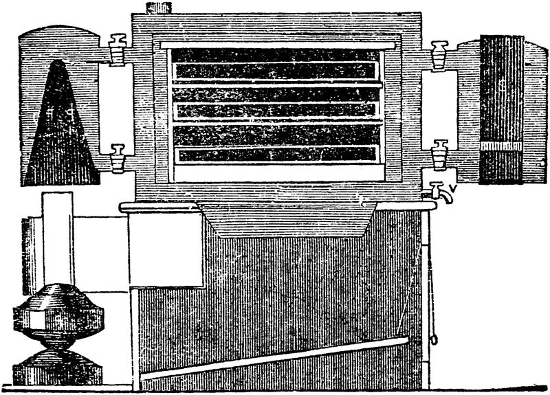 Fig. 43 represents an egg-hatcher or Eccalobeon, made of different sizes, with shelves so arranged as to hold from 200 to 800 eggs without touching each other. The outer box is a non-conductor, so as to retain the heat conveyed to every part by water tubes, connected by a reservoir below, the bottom of which is heated by the flame from a spirit-lamp. The temperature is indicated by a thermometer on the door inside, which should be made equal to that of the hen, say about 106° Fahrenheit. Her natural temperature is somewhat elevated by the feverish condition of the bird at the period of incubation.