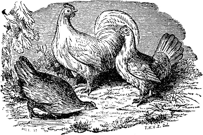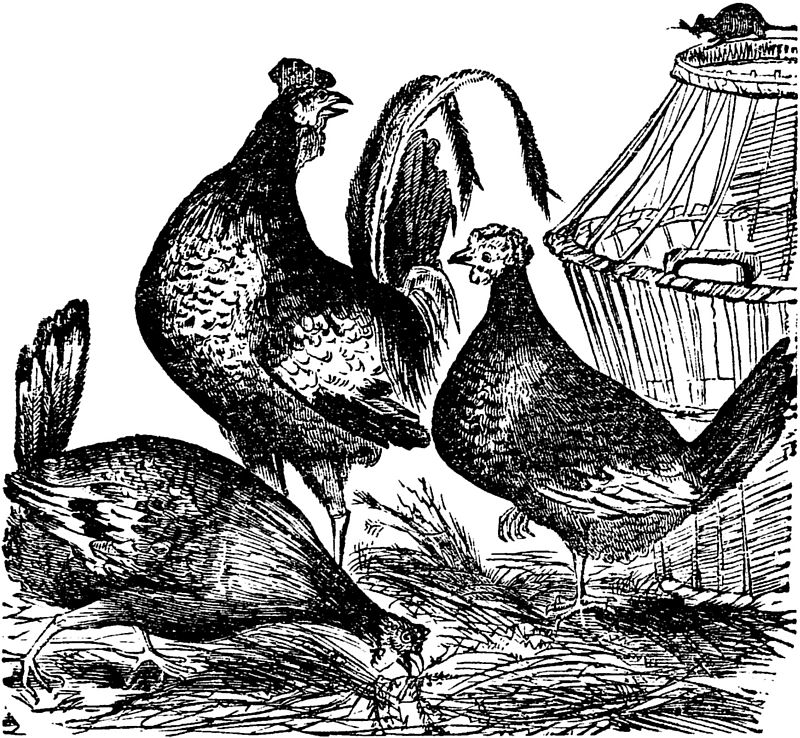 The Bantam is but little larger than a pigeon, and is usually of a pure white, but is sometimes speckled. It is generally feathered to the toes, but may be bred with clean legs. It is very domestic, and a pleasant little bird around the premises, and is not unprofitable. The Game cock is of medium weight, and yields good flesh, but is a poor layer, and an undesirable tenant for the farm-yard. Besides these, there are many fanciful varieties, as the Creeper, with excessively short legs; the Rumpless, without a tail; the Frizzled, with irregular feathers turned towards the head; the Silky or Merino fowl, with brown or buff down, instead of feathers; the Negro, with its black crest, wattles, skin, legs, and feathers; the Java and Cochin China, of great size; several varieties of the Top-knot, and others.[Pg 222]