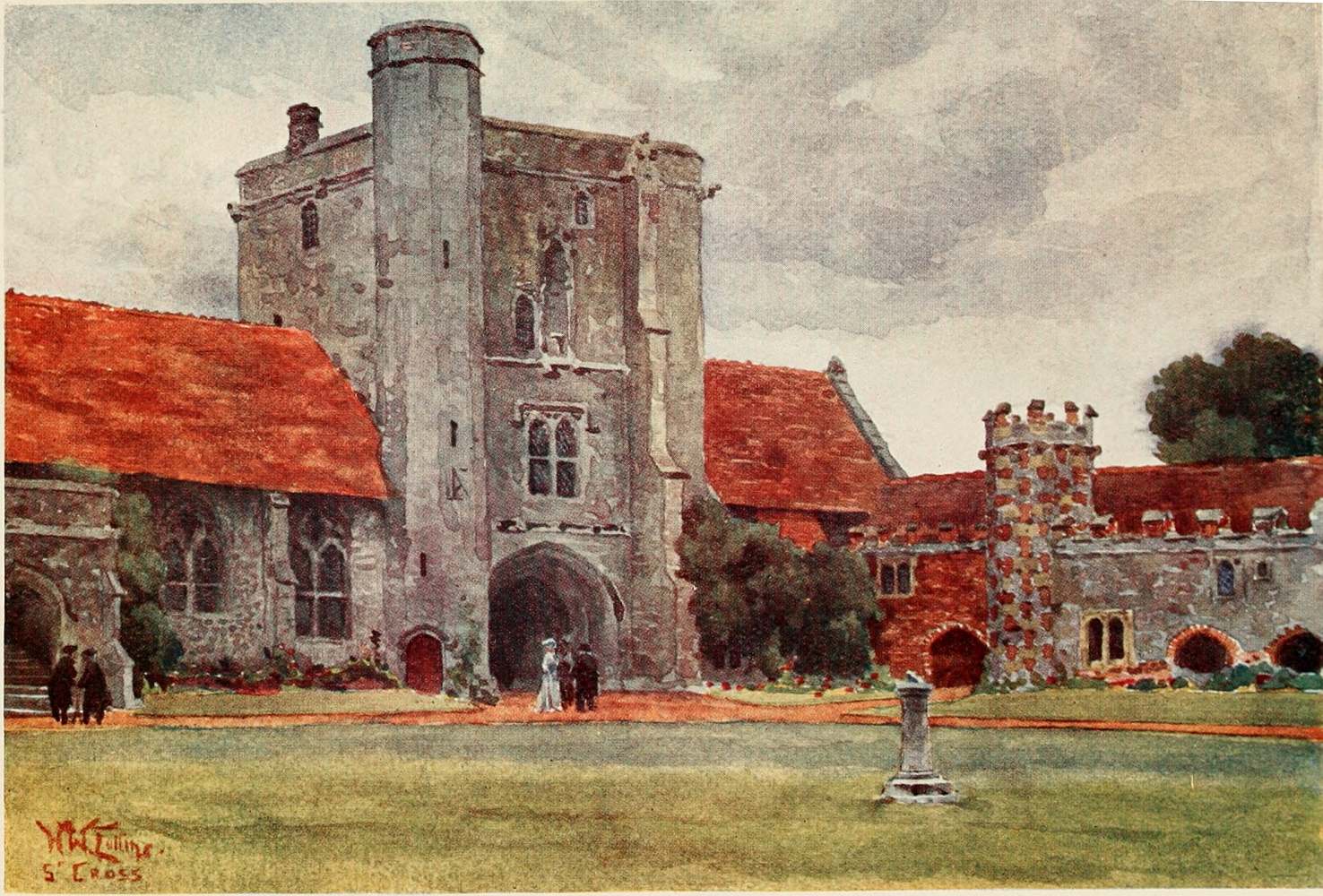 The black marble font is an interesting relic of eleventh-century skill. The sides are composed of scenes taken from the life of St. Nicholas. The Cathedral, situated in an open space near the centre of the city towards the south-east, is a marvellous combination of beauty and dignity, surpassed, if at all, by few. It is the central feature of Winchester, and will always command the greatest admiration. One of England's great public schools is that founded by William of Wykeham and built between 1387 and 1393. The foundation originally consisted of a warden, ten fellows, three chaplains, seventy scholars, and sixteen choristers. The prelate had previously established a school here in 1373. Thus the oldest of England's great schools was called "Seinte Marie College of Wynchester," the charter of which was dated October 1382. The ancient statutes were revived in 1855, and were still further influenced by the Public Schools Act of 1868. The establishment has a fine chapel, hall, cloister, and other necessary buildings, all in excellent preservation. Another interesting structure is that afforded by the hospital of St. Cross, founded in 1136 by Henry de Blois, Bishop of Winchester. It lies about a mile out of town. Its general plan can be readily seen by a glance at Mr. Collins' drawing. Henry de Blois intended it to provide board and lodging for thirteen poor men, and a daily dinner for one hundred others. It was mostly rebuilt by Cardinal Beaufort between 1405 and 1447. The whole has undergone much restoration, which was not entirely happy, though it has certainly kept the buildings in a good state of preservation. On the precincts is also the very stately cruciform chapel, dating roughly from the year 1180. The city of Winchester was at one time proverbial for its splendour, which was owing to the many kings that preferred to reside within its walls than elsewhere.