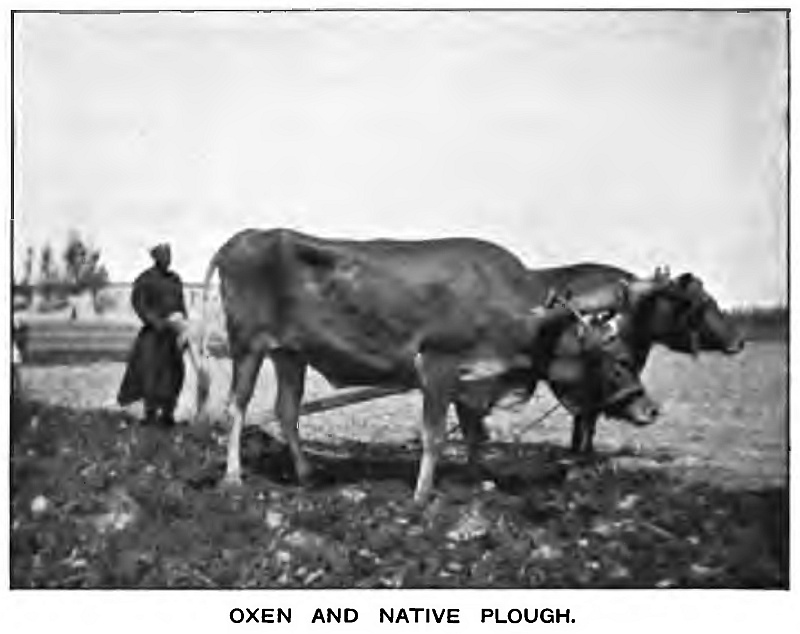 Attached to the building above referred to were well-erected ranges of cattle-sheds, not occupied for fattening purposes, but for the culture of the farm, this culture being carried on not by horses, but by oxen—buffaloes and ordinary bullocks—which are regularly used, as at one time in Old England, yoked to the plough, harrow, or roller, and on some of the high grounds which are let by his Highness, for turning the water-wheels, though on the model farms steam power only is used for the purposes of irrigation.