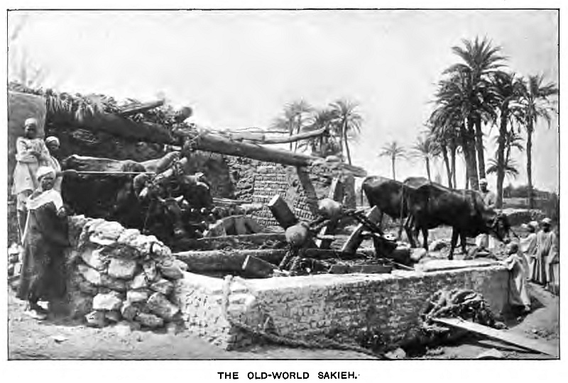 Among the minor objects familiar to the tourist in his journey up the Nile are the various means of raising water for the irrigation of the crops. These have been, and still continue to be in many places extremely primitive, for, as before stated, the fellaheen in their conservative fashion are prone to cling to the inventions of their forefathers. Hence they may still be seen laboriously at work with their shadoofs, sakiehs, and other water-wheels worked by hand or mule power, raising the fertilising fluid to a sufficient height to be discharged and flow of itself, spreading over the patches of land requiring irrigation.