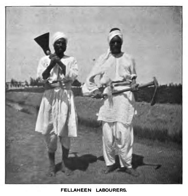 The illustrations of the fellaheen farm labourers and their wives are typical of the class of people with whom he would have to deal, and if the new adventurer objected to the class of hut they occupy, and had lofty ideas about model dwellings and the introduction of lighter implements in place of the clumsy, adze-like hoes with which they are armed rather than furnished, the advice given to him would be to follow that of the old Latin proverb, “Festina lente,” and go by degrees in that, as in most of the other matters of culture, for it takes time to alter custom and change old-fashioned routine.