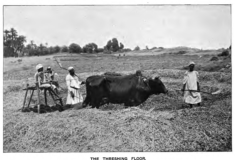 The foremen then distribute to the reapers one sheaf for thirty-five, as payment in kind. The reason for reaping the crop by night is that, if performed in the daytime, while the heat is great, the grain would shed, the dews at night preventing this loss. Reaping by self-binders has been tried, but the shedding of grain was excessive, as they could only be worked in the daytime; while the farm labourer was not qualified to work such a complicated machine. Labour is so cheap that it is not necessary to resort to labour-saving machinery. The sheaves (unbound) are transported from the fields to the threshing-floor by camels, carts drawn by oxen, or mules. The sheaves are then placed in a circle measuring twenty yards in diameter. Four, five, or more pairs of oxen, each pair attached to a Norag, circle round on the top of the grain, and when it has been threshed out and the straw cut and bruised by the revolving discs and the feet of the oxen, it is thrown into a heap in the centre. Fresh sheaves are added to the circle as they arrive. When all the grain has been threshed the next process is the winnowing by throwing the cut straw and grain into the air vertically by means of a five-pronged wooden fork. The cut straw, Tibn, is carried by the wind to a distance, while the grain falls near to the operator.