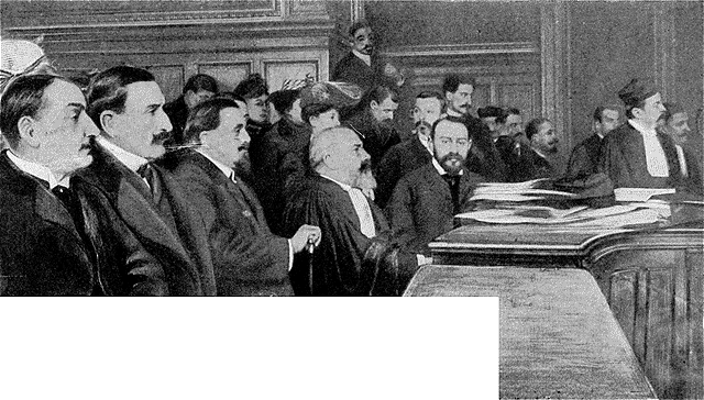 La salle des criées, ainsi construite, se trouve avoir, comme une salle de parlement, une droite et une gauche qui se font face. Le sort a voulu que les clients de Me Millerand, les novateurs, les contempteurs du vieil ordre de choses, les révolutionnaires, se groupassent à l'extrême gauche, tandis que les partisans du statu quo, les conservateurs, défendus par Me Poincaré, prenaient place à l'autre bout de la salle. A droite: tous les «sociétaires» de la Société des auteurs et compositeurs dramatiques. A gauche: des stagiaires et les trusrers.