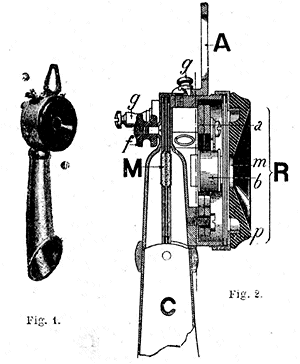 Le cornet C transmet les ondes sonores, émises dans son voisinage, au minuscule microphone à pastilles de charbon M. Ce microphone possède une sensibilité remarquable, parce qu'il se trouve frappé sur ses deux faces par les ondes sonores. En a, b, m, on remarque l'aimant les bobines, et la membrane ordinaires placés derrière l'embouchure R p. Le téléphone peut être suspendu par un crochet A et le courant lui arrive par les bornes g, f. Cet appareil se trouve à la Société Industrielle des Téléphones, 25, rue du 4 Septembre, Paris, au prix de 80 francs, moins la reprise de l'ancien appareil combiné.