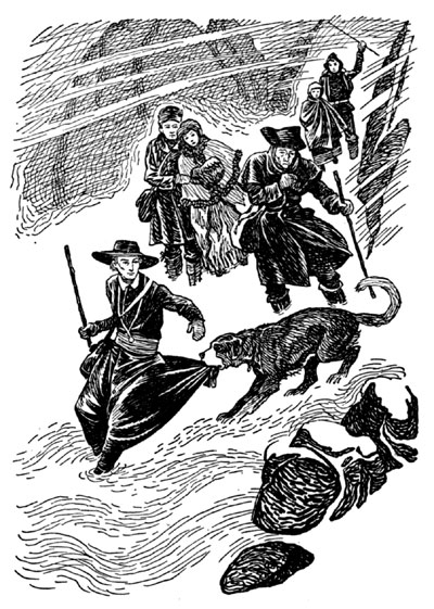 He recognized Father Benjamin's voice but he dared not look back, for even a fairy could not have found more standing room on the thin ledge where the boy and his dog stood. Franz reached down with his shovel to scoop out the next ledge.