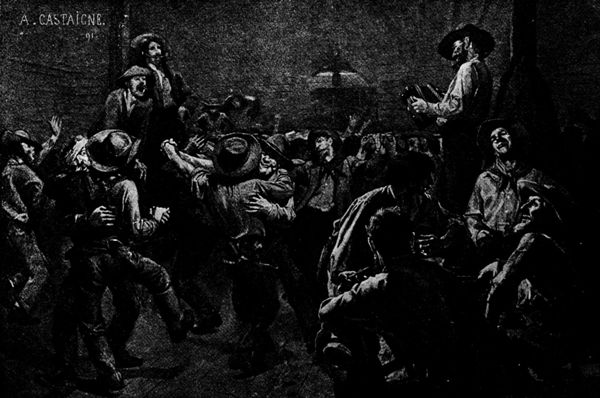 [33] Dancing was a common amusement among the miners even when there were no women to be had as partners. “It was a strange sight to see a party of long-bearded men, in heavy boots and flannel shirts, going through all the steps and figures of the dance with so much spirit, and often with a great deal of grace; hearty enjoyment depicted on their dried-up, sun-burned faces, and revolvers and bowie-knives glancing in their belts; while a crowd of the same rough-looking customers stood around, cheering them on to greater efforts, and occasionally dancing a step or two quietly on their own account.”—Borthwick’s “Three Years in California.”