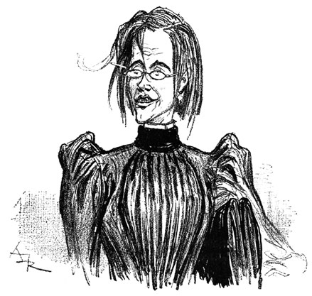 La cérémonie a été imposante. Comme M. Philox Lorris se préparait à voler, en soupirant, un quart d'heure à ses occupations pour aller donner la signature indispensable, à la mairie, une avouée se présenta, en même temps qu'une grêle de papiers timbrés et de phonogrammes d'avoués, d'huissiers et autres officiers ministériels s'abattait sur lui. C'étaient Mlles la doctoresse Sophie Bardoz et la sénatrice Hubertine Coupard, de la Sarthe, qui entamaient chacune un procès en rupture de négociations matrimoniales, demande en mariage impliquant promesse, et demandaient chacune 6 millions de dommages-intérêts.