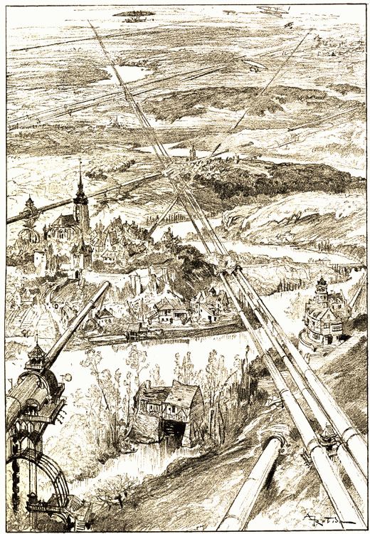 La noce se dirigea ensuite vers l'église, où se pressaient déjà toutes les notabilités de la science, de la politique, de l'industrie, du haut commerce, des lettres et des arts. Plus de douze cents aéronefs ou aérocabs se balançaient au-dessus de l'édifice et ce fut un charmant coup d'œil que le défilé de tous ces élégants véhicules aériens escortant les nouveaux époux jusqu'à l'hôtel Philox Lorris.