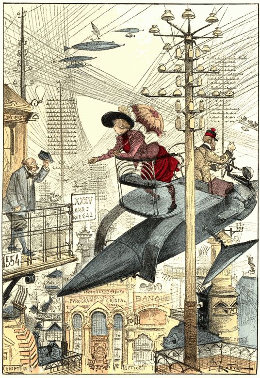 Le danger avait disparu, mais non les dernières traces de la grande perturbation. Sur la plaque du téléphonoscope de Georges Lorris, comme sur tous les Télés de la région, passèrent avec une fabuleuse vitesse des milliers d'images confuses et des sons apportés de partout remplirent les maisons de rumeurs semblables au rugissement d'une nouvelle et plus farouche tempête. Il est facile de se figurer cette assourdissante rumeur, ce sont les bruits de la vie sur une surface de 1,600 lieues carrées, les bruits recueillis partout par l'ensemble des appareils, condensés en un bruit général, reportés et rendus en bloc par chacun de ces appareils avec une intensité effroyable!