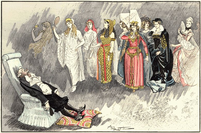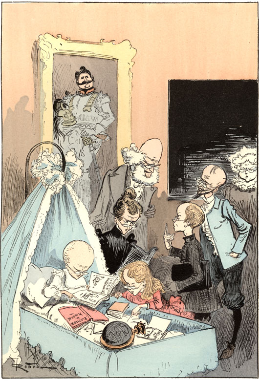 «Oui! un artiste! s'écria-t-il, et encore un artiste idéaliste, nébuleux, romantique, comme ils disaient alors, un rêveur, un futiliste, un éplucheur de fadaises!... Tu penses bien que je me suis renseigné... Pour connaître toute l'étendue de mon malheur, j'ai consulté nos grands artistes actuels, les photo-peintres de l'Institut... Je sais ce qu'il était, ton trisaïeul! N'aie pas peur, il n'aurait pas inventé la trigonométrie, ton trisaïeul!... Il n'eut à sa disposition qu'une cervelle légère et vaporeuse évidemment, comme la tienne, dépourvue des circonvolutions sérieuses, comme la tienne, car c'est de lui que tu tiens cette inaptitude aux sciences positives que je te reproche. O atavisme! voilà de tes coups! Comment annihiler l'influence de ce trisaïeul qui revit en toi? Comment le tuer, ce scélérat? Car tu penses bien que je vais lutter et le tuer...