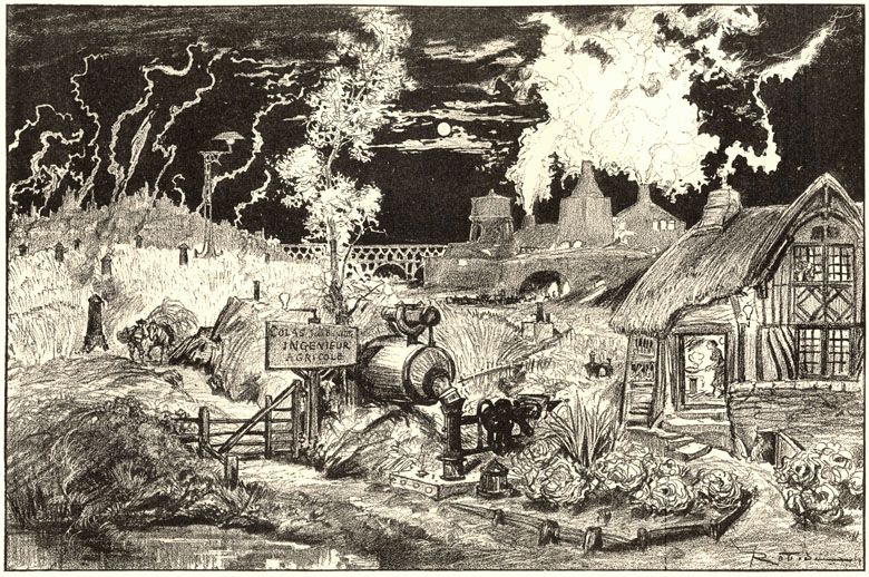 Quand les aquilons farouches nous soufflent le froid des banquises polaires, nos électriciens dirigent contre les courants aériens du Nord des contre-courants plus forts qui les englobent en un noyau de cyclone factice et les emmènent se réchauffer au-dessus des Saharas d'Afrique ou d'Asie, qu'ils fécondent en passant par des pluies torrentielles. Ainsi ont été reconquis à l'agriculture les Saharas divers d'Afrique, d'Asie et d'Océanie; ainsi ont été fécondés les sables de Nubie et les brûlantes Arabies. De même, lorsque le soleil d'été surchauffe nos plaines et fait bouillir douloureusement le sang et la cervelle des pauvres humains, paysans ou citadins, des courants factices viennent établir entre nous et les mers glaciales une circulation atmosphérique rafraîchissante.