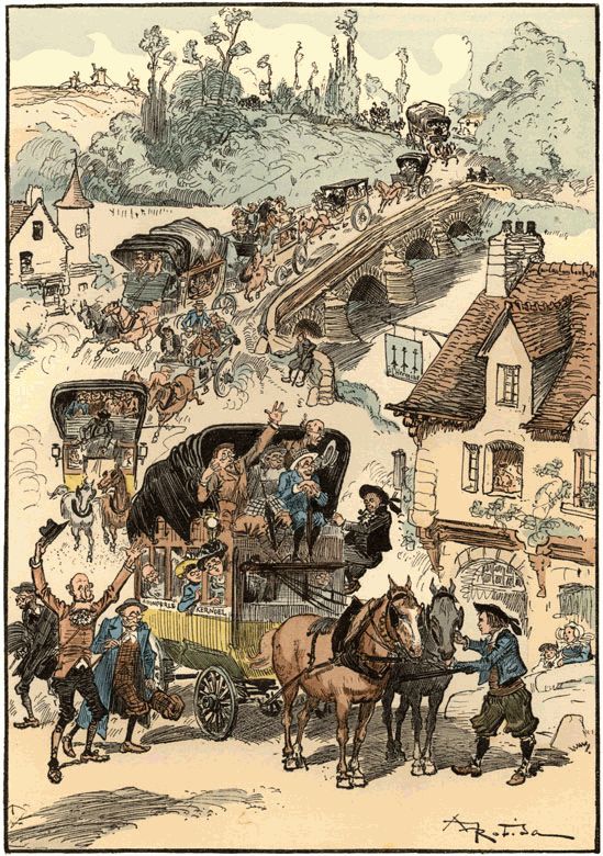 Les semaines passèrent vite dans ces délicieuses solitudes... Un jour vint cependant où elles furent envahies. C'était le commencement des vacances. Toutes les diligences du pays, toutes les carrioles, toutes les guimbardes roulaient chargées de gens pâles et fatigués, dont les têtes ballottaient sous les cahots des chemins. C'était l'arrivée annuelle des citadins lamentables venant chercher le repos et puiser de nouvelles forces dans le calme et la tranquillité des landes, l'arrivée de tous les énervés et de tous les surmenés, accourant se rejeter sur le sein de la bonne nature, haletants des luttes passées et heureux d'échapper pour quelque temps à la vie électrique.