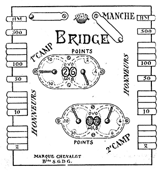 A la fin de la manche, on reporte les «points» de chaque camp avec les «honneurs» que l'on marque au moyen de touches à ressorts, après quoi, l'on ramène les aiguilles des cadrans à zéro pour la manche suivante. Lorsque la «belle» est jouée, il reste à écrire les comptes individuels des joueurs de la même manière qu'à la fin d'une partie de whist. Cette marque se trouve en vente, simple, au prix de 28 francs; avec touches ivoire, 35 francs, chez M. Lefranc, 109, faubourg du Temple, Paris.