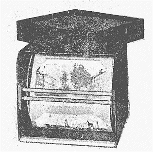 Au moyen de la glace dont le Polyorama est muni, on obtient des reflets et une animation du plus charmant effet qui donnent à l'oeil une illusion de la réalité. Nos gravures montrent la disposition intérieure de l'appareil. Le tambour-boîte que représente la figure 2 présente, en tournant devant la fenêtre vitrée, la collection de cartes postales qui sont simplement fixées dans des encoches pratiquées dans une bande de papier spécial enroulée sur ce tambour. L'appareil fermant à clef, la collection se trouve ainsi, non seulement à l'abri de la poussière, mais encore du toucher et de toute soustraction possible; il est pourvu d'encoches qui permettent la pose et le changement faciles de tous les objets classés, par séries, si on le désire, verticalement ou horizontalement, sur des tambours-boîtes pouvant recevoir de 120 à 150 cartes et se substituer les uns aux autres, avec plus de facilité même qu'un changement de cylindre ou de disque dans les appareils phonographes. Les boutons actionnant ces tambours de l'extérieur sont fixes ou mobiles, au choix; dans ce dernier cas, une fois retirés, l'appareil ne peut plus fonctionner; le propriétaire, de ce fait, est absolument maître de sa collection.