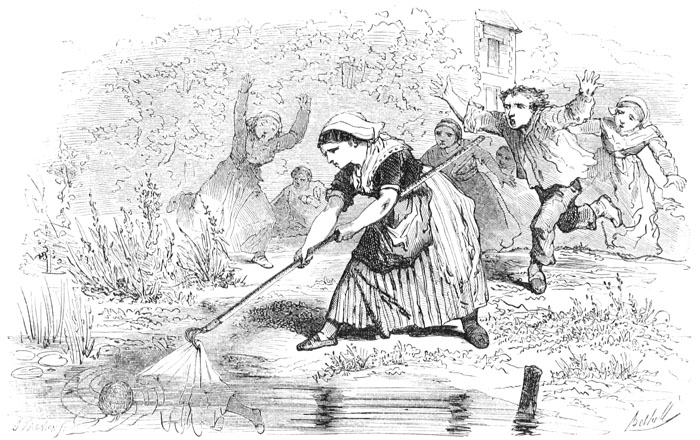 Camille étend la petite fille sur ses genoux; Madeleine apporte de l'eau qu'elle a été chercher dans un fossé; Camille lave et essuie avec son mouchoir le sang qui inonde le visage de l'enfant, et ne peut retenir un cri de joie lorsqu'elle voit que la pauvre petite n'a pas de blessure.