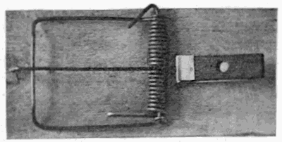Steel trap.—The ordinary steel trap (No. 0 or 1) may sometimes be satisfactorily employed to capture a rat. The animal is usually caught by the foot, and its squealing has a tendency to frighten other rats. The trap may be set in a shallow pan or box and covered with bran or oats, care being taken to have the space under the trigger pan free of grain. This may be done by placing a very little cotton under the trigger and setting as lightly as possible. In a narrow run or at the mouth of a burrow a steel trap unbaited and covered with very light cloth or tissue paper is often effective.