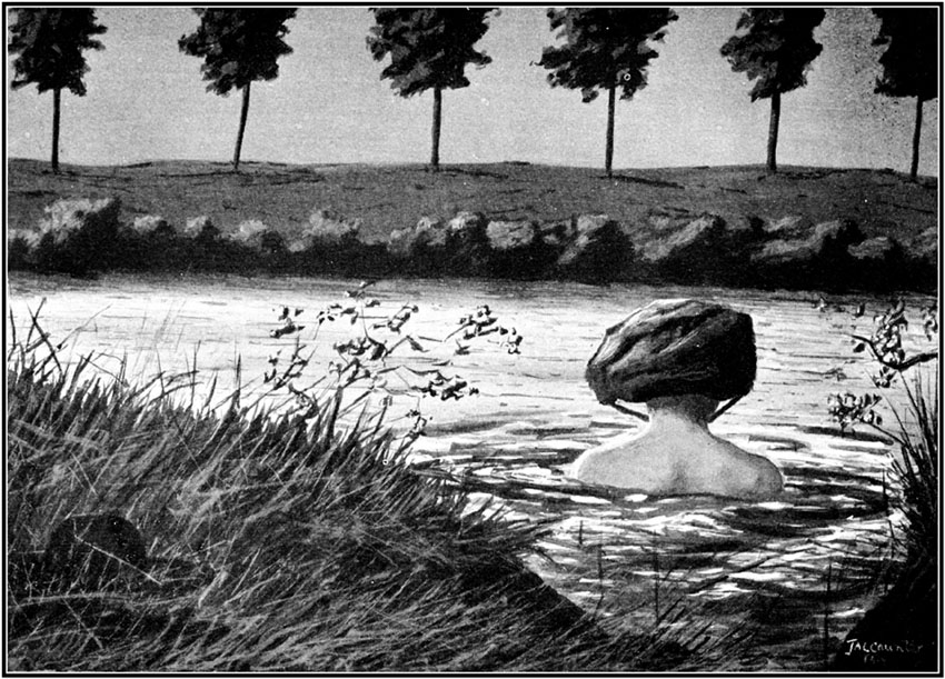 [206]I tied my boots to my waist-belt and then tried to balance my coat on to the top of my head. This would not work. Time after time it rolled off on to the grass. I suppose the top of his head is flatter than mine, but on mine the bundle would not stay. At last, desperate at seeing him on the other side of the river trying to land, I tied my coat on to my left shoulder with a large handkerchief to hold it there, knotted round my neck. Then I also took to the water, swimming on my right side, so as to keep my coat and its contents as dry as possible.