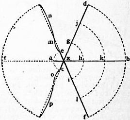 | Fig. 25 shows how different portions of the wing travel at different degrees of speed. In this figure the rod a, b, hinged at x, represents the wing. When the wing is made to vibrate, its several portions travel through the spaces d b f, j k l, g h i, and e a c in exactly the same interval of time. The part of the wing marked b, which corresponds with the tip, consequently travels very much more rapidly than the part marked a, which corresponds with the root. m n, o p, curves made by the wing at the end of the up and down strokes; r, position of the wing at the middle of the stroke. |