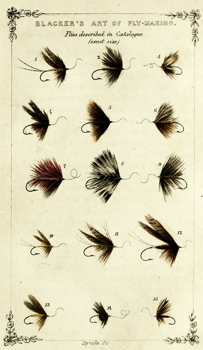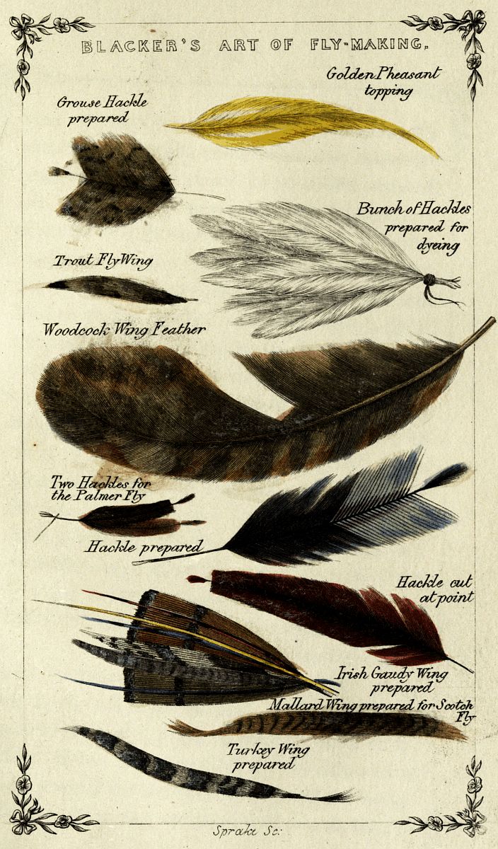 The necessary articles used for fly making in general are as follows: Those feathers that are of a most gaudy hue are best for the wings of salmon flies, which are golden pheasant feathers, cock of the rock, the crest of the Hymalaya pheasant, the blue and yellow macaw, the scarlet macaw, red macaw, green parrot's feathers, particularly the Amazon parrot tail, the scarlet Ibis, blue king fishers, and chattern, the splendid Trogan, the Argus pheasant, the bustard, red parrot, and the Bird of Paradise; the wood-duck feathers (try the cock of the north feathers, black hackle, white body, and gold); the jungle cock; the spotted turkey, brown, light, and dark feathers; brown mallard, or wild drake; teal feathers; heron feather, black and blue; glede or kite tail feathers; grey mallard, widgeon, and shovel duck; various dyed and natural cock hackles; grouse[257] hackles; guinea hen hackles, the rump and back feathers; silver pheasant, cock and hen bird tail, wings, and body feathers; yellow toucan feathers; blue jay feathers, and the wings of the jay for trout flies; peacock feathers, off wings, tail, and body; black ostrich feathers, and the white ostrich for dyeing all colours for the heads of flies, &c., with floss silk of every shade; gold and silver twist, and plate of different sizes; pighair, mohair, furs, &c.