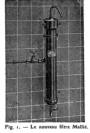 Dans les périodes de chaleur où l'eau est une cause de maladies graves, nous croyons intéresser nos lecteurs en leur signalant le nouveau type de filtre perfectionné de M. Mallié, dont les avantages se résument en deux mots: grand débit et stérilisation complète.