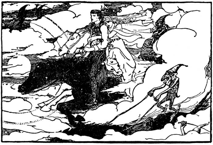"If you are, come along," said the little man, and out they went all together, riding like the wind, faster than the fastest horse ever you saw a-hunting, and faster than the fox and the hounds at his tail.