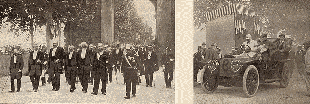 | M. Dubief. M. Berteaux, M. Ruau. M. Chaumié. M. Gauthier. Le maire, M. Serres, Le général Fabre. M. Cruppi, député. Cinq ministres à Toulouse pour la distribution des récompenses. | Le baron Henri de Rothschild sur la voiture 83. |