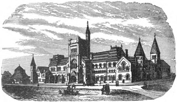 "Fair Toronto is also herself richly robed and jewelled, her necklet being of picturesque villas, in Rosedale and on Bloor Street; under her corsage, covered with beauteous blossoms from her Horticultural Gardens, her Normal School grounds, etc., her heart throbs with pride as she thinks of her gems, the spires from her one hundred and twenty churches glistening in heaven's sunbeams; of her magnificent University of Toronto, with its great Norman tower, which cost her nearly $500,000; her handsome Trinity College, in third period pointed English style; her Knox College, her hotels, her opera houses, her stately banks; with her diamonds, of which she is vastly proud, and which are her great newspaper offices—the most valuable being those of first water, viz., her Church papers as finger-posts, with her Sentinel as guard; her independent, cultured Mail; her mighty clear-Grit Globe; her brilliant, knowing Grip; her often-quoted World; her racy town-cry News; her social Saturday Night; her Life, her Week, her Truth, with her Evening Telegram, the whole set being so valued by fair Toronto, that she would as soon be minus her daily bread as her newspapers.