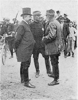 | La foule acclame le président de la République et le général Brugère, passant les troupes en revue dans une automobile conduite par le capitaine Lévêque.--Phot. Léon Bouet. | A Brienne: M. Casimir-Perier, ancien président de la République, M. le président Loubet et M. Berteaux. |